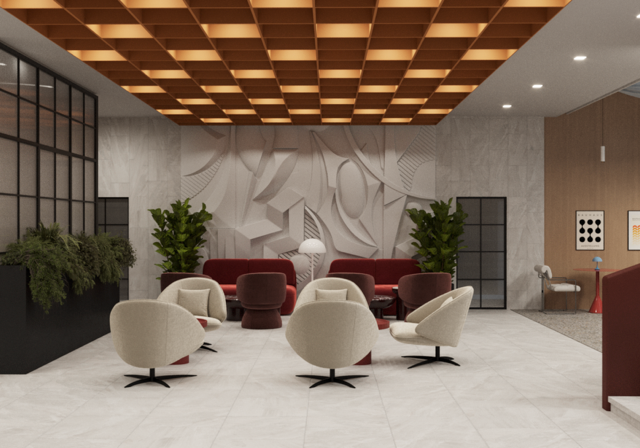 The spacious lobby longe on the first floor is designed in undertones of burgundy, green and natural oak color. We used post modernists and brutalists art and architecture to get inspired while designing this space. While our client did not want the space to fully reflect the period design, we still integrated several concepts, such as the plaster bas-relief wall that reminds us of the Soviet architecture.