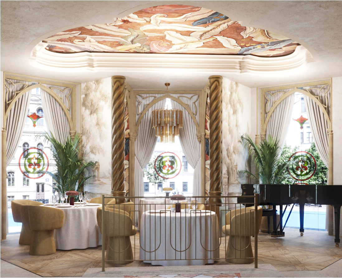 Легендарный ресторан переосмысливает концепцию. Мы разработали обновленную концепцию интерьера московского ресторана, символизирующего роскошь и успех последних двадцати лет. В новом прочтении венецианского палаццо мы осветлили отделку стен, расписали их ручными гравюрами и использовали современный свет.